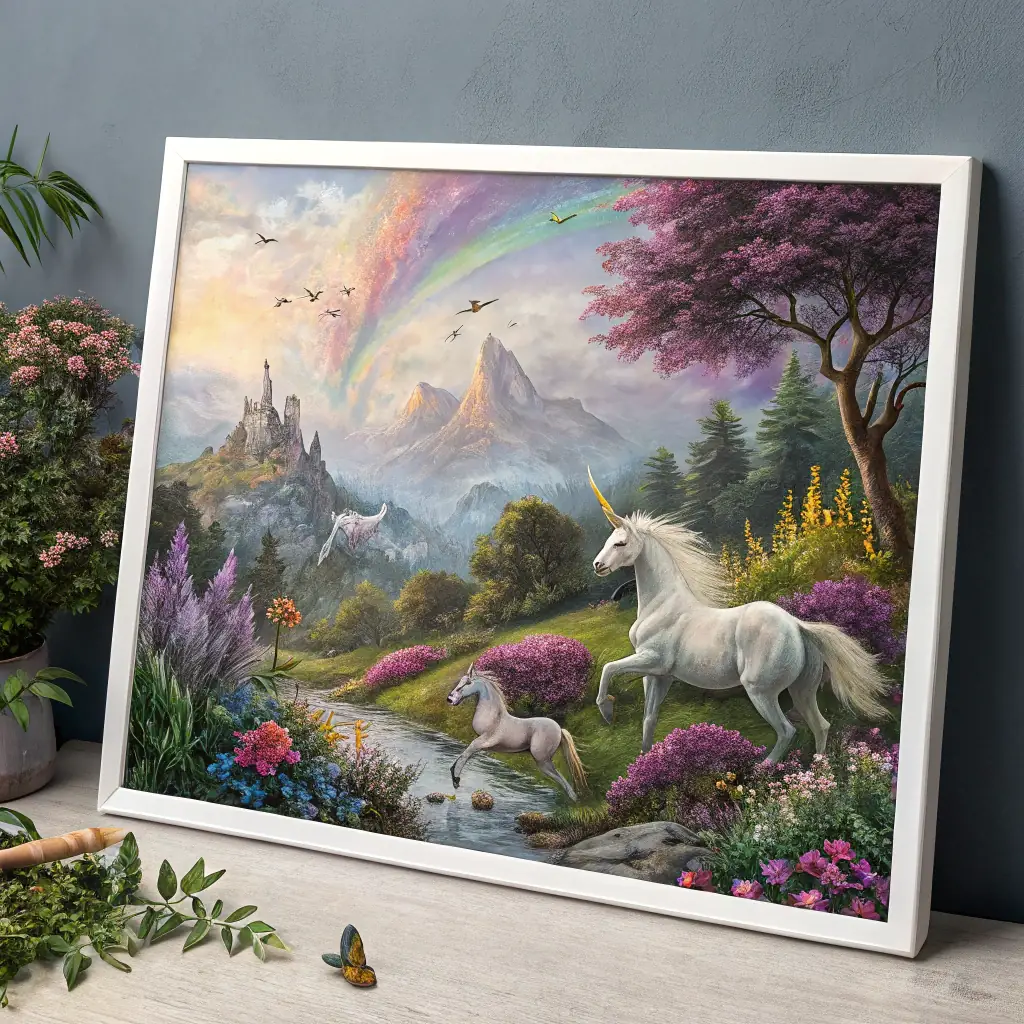Esta pintura artesanal retrata uma paisagem de fantasia vibrante, repleta de florestas místicas, montanhas imponentes e criaturas mágicas. Criada com atenção meticulosa aos detalhes, captura a imaginação e transporta os espectadores para outro mundo. Perfeita para entusiastas de fantasia e colecionadores que procuram arte de parede única. Cada peça é pintada à medida para atender à sua visão e preferências específicas.