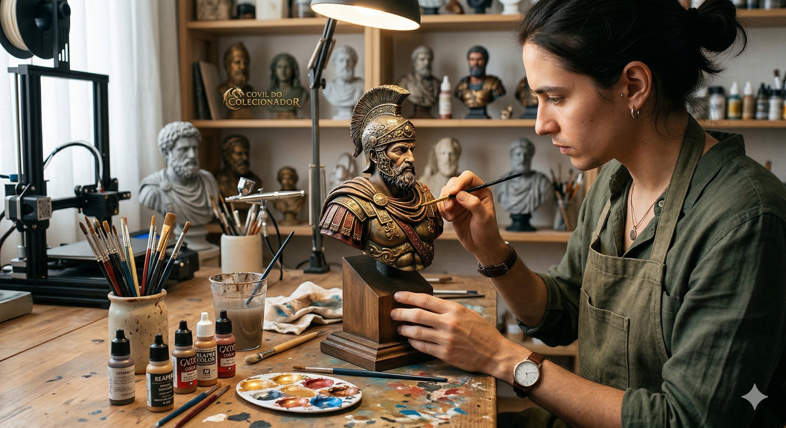 No Covil, cada peça é tratada como única. Unimos a precisão da modelagem digital e impressão 3D de alta resolução ao refinamento do acabamento feito à mão. O resultado é um colecionável de alto nível, com texturas e detalhes que você não encontra em produções de massa.